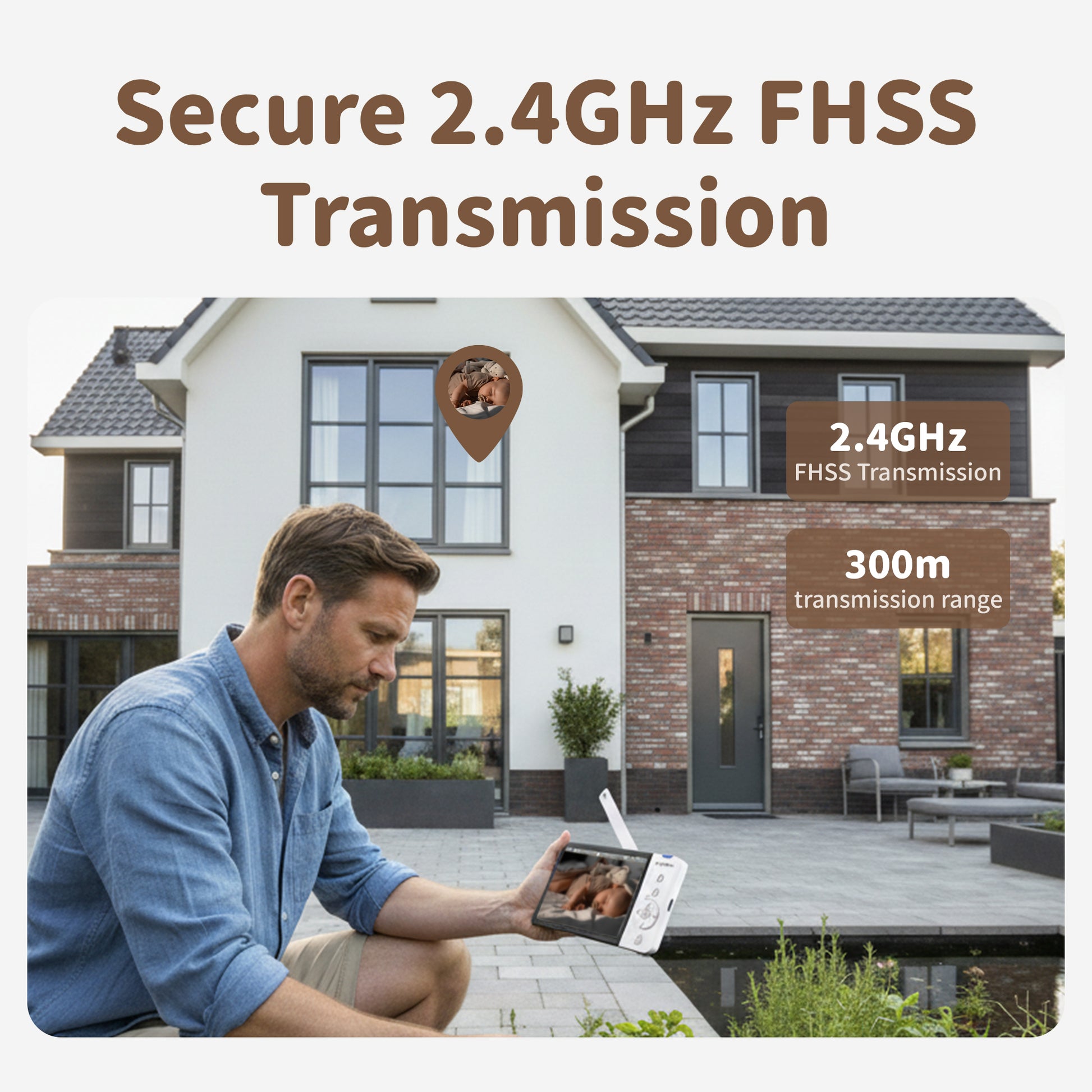 The dedicated 2.4GHz FHSS connection provides a stable and secure signal with a transmission range of up to 300 meters in open spaces. This system helps reduce interference and enhances data privacy compared to standard wireless connections.